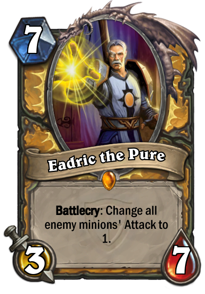 Eadric the Pure is, to describe it simply, a big [card]Aldor Peacekeeper[/card] with an AoE battlecry. Though that effect is nice, this card seems to be very expensive for its price. Pro player Stanislav “StanCifka” Cifka said this about the card: “I don’t think it’s good. It’s 7 mana, which is a lot for its stats. And when is your opponont going to have, like, 4 big creatures on the board?”. Ukranian player Alexander “Kolento” Malsh felt different about the card: “It’s an interesting card. Maybe it will create something like a Control Paladin”.