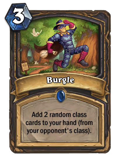 RNG can of course not be left out, and Burgle brings it to the Rogue. Unlike [card]Nefarian[/card], Burgle can give you any class minion from your opponent as well. Imagine getting a [card]Grommash Hellscream[/card] from your opponent. Or maybe even better, an [card]Archmage Antonidas[/card]. Yes, that would be a fantastic video and it would probably be in the next Trolden video. However, less fortunate outcomes could happen as well. Try working with [card]Recycle[/card], [card]Shield Slam[/card] or a [card]Flame Imp[/card]. Though, to be fair in the end, many class cards will be actually useful to a Rogue. [card]Unstable Portal[/card] sees play, and so will Burgle most likely as well.