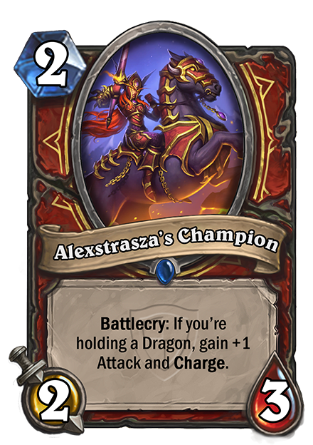 First, we have [card]Alexstrasza's Champion[/card] an early game Warrior minion with Dragon synergy. Normally an underwhelming 2/3 for 2, this minion can grow to 3/3 with Charge provided you hold a Dragon in your hand.