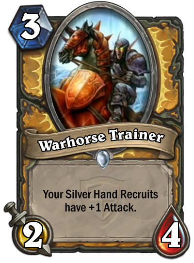 Finally, we arrive at [card]Warhorse Trainer[/card], a new Paladin card with a built-in synergy with your Silver Hand Recruits. A 2/4 for 3 mana, Warhorse Trainer buffs up the attack of your tokens with 1 and can be nicely squeezed in after a coined out [card]Muster for Battle[/card], for example, for quite a lot of damage.