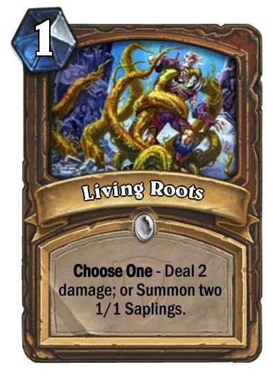 Druids are also getting a new 1-mana spell in [card]Living Roots[/card], ensuring that they no longer get a boring and empty T1 if they don’t draw [card]Zombie Chow[/card]. Living Roots can serve both as a removal again early drops like [card]Knife Juggler[/card] and as board-developing card that gives the Druid something to do while they ramp up.