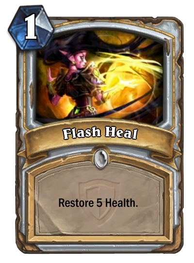 [card]Flash Heal[/card] is a new Priest spell for 1 mana that simply reads ‘Restore 5 health’. Application? Full health [card]Injured Blademaster[/card] on T4 without wasting a precious circle. A 5 damage spell with [card]Auchenai Soulpriest[/card]. And whatever other crazy synergies the yet unrevealed TGT cards might offer.