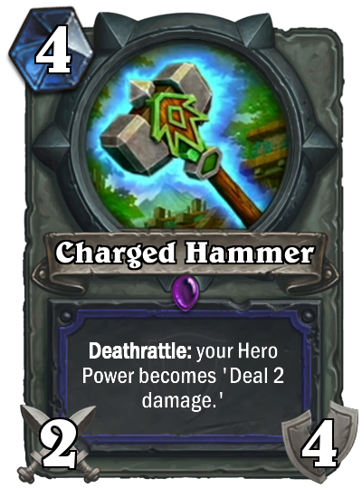 Next comes [card]Charged Hammer[/card], an interesting weapon for the Shaman class. Priced at 4 mana for 2/4, the Charged Hammer replaces your regular totem-spawning hero power with a simple ‘Deal 2 damage’ when it dies, essentially turning you into a Mage on steroids. You might be thinking that 4 durability is a lot to eat through, but don’t forget that equipping [card]Doomhammer[/card] on the next turn, for example, will trigger Charged Hammer’s deathrattle and provide you with that much more board control.