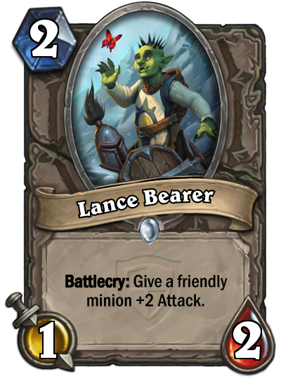 A new neutral early game minion has appeared on a French Hearthstone community site. Translated as Lance Bearer, this 2 mana 1/2 minion gives +2 attack to a friendly minion. Unlike [card]Abusive Sergeant[/card] or [card]Dark Iron Dwarf[/card], however, this effect is permanent.
