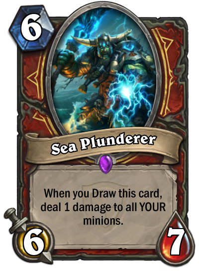 Priced at 6 mana for a 6/7 body, [card]Sea Plunderer[/card] is at first glance just a [card]Boulderfist Ogre[/card]. His twist, however, comes in his card effect. Similar to the behavior of [card]Flame Leviathan[/card], the Plunderer applies an effect when drawn and in this case it's 1 damage to all YOUR minions.