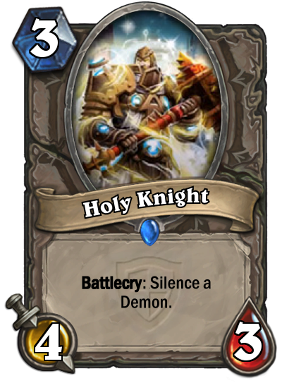 One more card was revealed mere minutes ago and it's called Holy Knight - or something along those lines, once again this is a translated version only. It's a 4/3 for three mana, so more than alright with regards to the stats, and its Battlecry is to silence a demon. So, if your deck is totally insane but always loses to [card]Mal'Ganis[/card] being pulled by [card]Voidcaller[/card], I guess you tech in this guy? The minion seems to be a preemptive measure by the games' designers in case Demon-decks are really going through the roof some day and probably wouldn't see much play right now. But then again, we haven't seen an awful lot of the new Warlock cards yet, so maybe the Holy Knight will become a viable choice.