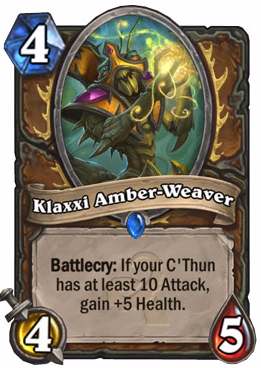 Titled Klaxxi Amber-Weaver, this new Druid 4-drop is the third card we see having a synergy with the legendary [card]C'Thun[/card]. Unlike [card]Beckoner of Evil[/card] or [card]Twilight Elder[/card], however, KAW does not provide a direct buff to the Old God. Instead, it grows to 4/10 from its normal 4/5 if C'Thun has more than 10 attack.