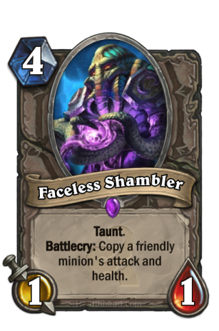 Following the vote on releases, Chinese streamer Anderonie has revealed a new card. A Neutral minion of epic quality, Faceless Shambler initially has very weak stats. His battlecry, however, does make up for this. The flexibility of the card is quite large, although not as good as his bigger brother, the Faceless Manipulator. A slight upside to the Shambler is that he has taunt from nature. This means that a player can play a valuable minion on turn 3 (or turn 1, if you're Druid), and then next turn protect it by making a copy of it. Not only will you then have 2 of the valuable minions, but you will be able to get more value from the minion you are protecting.