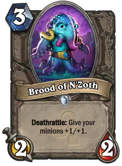 In its footsteps today followed Brood of N'Zoth. As scary as it might seem that the Old God N'Zoth even exists, he now turns out to be procreating too. German website buffed.de announced the 3 mana minion in a post earlier today. While the stats of this tiny evil spouse are not necessarily frightening, its deathrattle certainly has to be treated with care. It is a mixture between [card]Anubisath Sentinel[/card] and [card]Stormwind Champion[/card], and has the potential to seriously assist in acquiring board advantage. For now the most obvious application would be in some sort of Zoo deck, which revolves about creating a strong board with cheap minions.