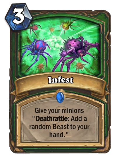 After cards such as [card]Webspinner[/card] and [card]Ram Wrangler[/card], a new "summon a random beast" card will arrive in Hearthstone. Infest combines the effect of the earlier mentioned Webspinner with [card]Soul of the Forest[/card], in a sense that all minions on your side of the board are affected. Synergies with this card are found in [card]Feign Death[/card] and [card]Baron Rivendare[/card], but both those cards are rotated out when Standard hits Hearthstone, not to mention these cards are completely absent in the current meta.
