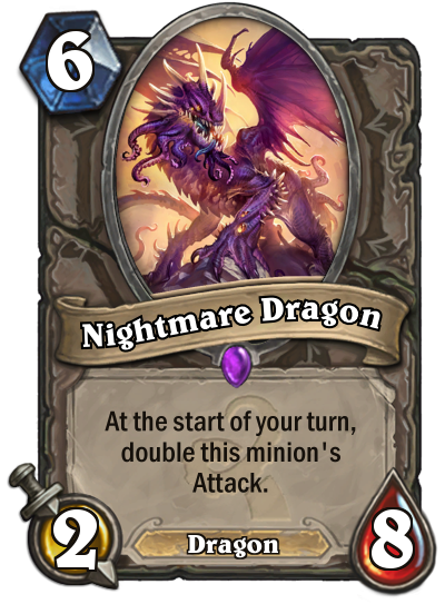 Nightmare Dragon represents one of the few end-of-turn growing effects in Hearthstone, another notable one being [card]Gruul[/card]. This 6-drop starts as 2/8 but doubles its attack at the end of each of its controller’s turn. Left unchecked for a couple of turns, at you’re looking at a 4/8, 8/8, 16/8 and beyond.