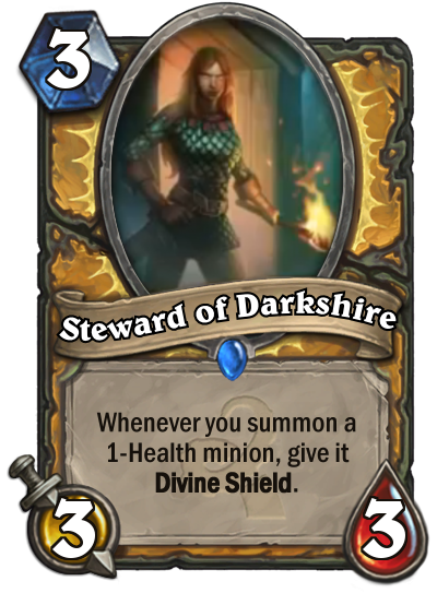 Speaking of minions that could fit in Paladin, say hello to Steward of Darkshire. A 3/3 for 3 mana, Steward of Darkness gives divine shield to a friendly 1-health minion when summoned. The card screams “aggro paladin”, able to not only empower staple early drops like [card]Leper Gnome[/card], but also the tokens summoned through the hero power. The potential of T3 Steward into T4 Coin + [card]Stand Against Darkness[/card] also sounds powerful, but as always it will come down to extensive testing to see if and how this card will fit the new standard meta.