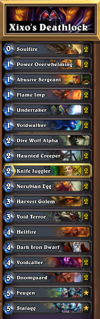 Another very interesting combo-ish deck that’s been getting popularity is Sebastian "Xixo" Bentert’s Deathrattle Warlock deck. Based on the foundations of the Zoo, this deck starts with small drops like [card]Flame Imp[/card], [card]Voidwalker[/card], [card]Haunted Creeper[/card] and [card]Knife Juggler[/card] but once it has all the pieces together, it starts getting scary.