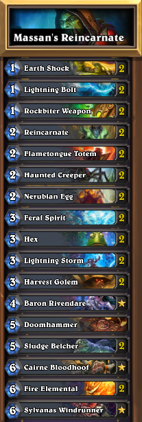 On the right we see Harry "Massan" Cheong’s Reincarnate Shaman deck as displayed on his personal website. The goal of the deck is to populate its own board through Deathrattle summon effects (Haunted Creeper, Nerubian Egg, Cairne, Sludge Belcher, Harvest Golem) or steal opponent’s threats by targeting its own Sylvanas.
