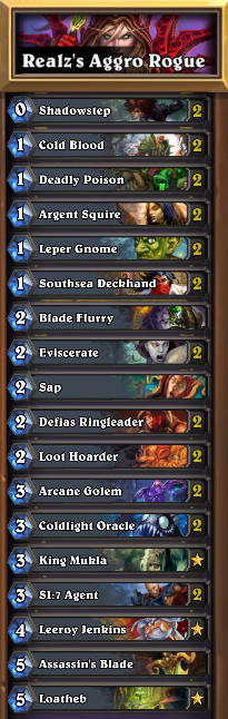 Channeling the inner aggression of the Rogue class, this build is all about hitting the enemy in the face, hard. The deck was initially designed to counter the slower, meta-defining decks of pre-Naxx like Handlock and Miracle because they had hard times living till their finishers or had their cards burnt from Coldlight Oracle and King Mukla.