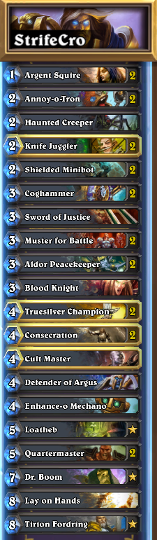 As is evident, the Divine shield mechanic is a big part of StrifeCro's list. He has cards which use it on all turns 1-3 and tops it off with a singleton [card]Blood Knight[/card] which can often come in as a 9/9. Additionally, there's a single [card]Enhance-o Mechano[/card] to re-shield the board in later turns in case [card]Blood Knight[/card] isn't drawn early.