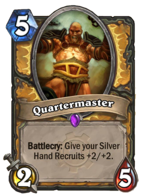 - The [card]Quartermaster[/card] combo is more difficult to pull off in subsequent turns as a T4 MfB will likely be cleared by a sweeper, but it can come down on T8 for three 3/3's and a 2/5 or on T10 for four 3/3's (counting hero power) and a 2/5.