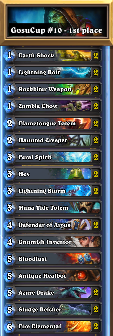 There isn't anything fancy about this deck: it's just solid, mid-range build that will teach you how to play the class correctly. It has all the value removal spells and tempo cards like [card]Feral Spirit[/card] and a singleton [card]Bloodlust[/card] to kill enemies when they least expect. If you want to start playing Shaman, this is one of the best decks to do so.