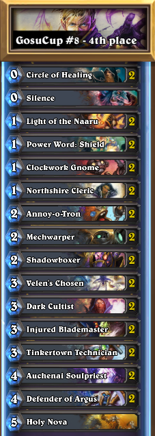 I play a lot of Hearthstone but I am yet to see a mech Priest. Yet here it is now, rocking GosuCup in style with [card]Shadowboxer[/card]s and all the cool Priest antics.