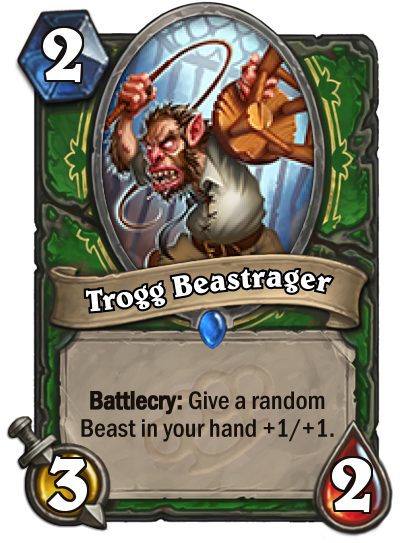 Trogg Beastrager is the first of the three, a 2-mana 3/2 Hunters minion that buffs a random beast in hand with +1/+1. For Rexxar fans, this is an opportunity to drop scarier [card]infested wolf[/card] or more durable [card]stranglethorn tiger[/card]s in the mid-game.