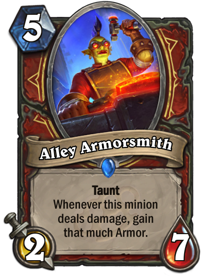 Meet Alley Armorsmith, a 2/7 5-drop for Warrior, part of the Grimy Goons mob family. A very durable taunt minion, the Alley Armorsmith generates armor equal to the amount of damage it deals. Being a very durable minion that also feeds your [card]shield slam[/card], Alley Armorsmith might even replace [card]bloodhoof brave[/card] in control or tempo builds.