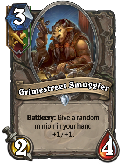 Grimestreet Smuggler is the second card revealed in the last batch. A Grimy Goons tri-class minion, the Smuggler uses the new hand-buffing mechanic and gives a random minion +1/+1 on Battlecry. A 2/4 for 3 mana on the common slot, this looks like a good minion for Arena at least.