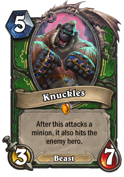 When Hunter legendaries are announced, they are always thoroughly evaluated. With every expansion there is hope for finally a good one, but so far [card]Gahz'rilla[/card], the combo of [card]Acidmaw[/card]&[card]Dreadscale[/card] and [card]Princess Huhuran[/card] have all failed miserably. Looking at the new one, Knuckles, one wonders what potential it holds. It's reminiscent of [card]Oasis Snapjaw[/card], boasting incredible health stats but with a potentially painful effect. Again following the Grimy Goons' theme, having Knuckles buffed is a reward on its own. It combines the aggressive aspect of Hunters with a board controlling option, especially if it's granted taunt by [card]Houndmaster[/card]. Knuckles is not a build-around card per se, but it might just fill up the 5-cost slot in Hunters as it's not a slot with much competition.