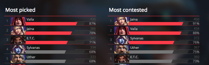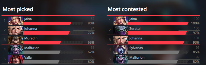 As it stands now, Jaina is the only hero that as truly stood the test of time in terms of overall competitive popularity. While Zeratul has always been a strong hero due to Void Prison, his new Focused Attack + Follow Through gives him the burst damage he previously loss with nerfs to his Double Bombs and Gathering Power talents. Johanna is another new hero that has lived up to her potential and ,while still a niche pick, The Butcher also looks to also be a success.
