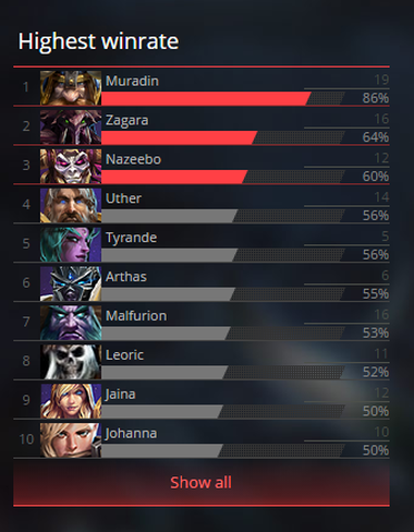 - The data shows that Muradin rocks the highest win rate. A big part of this stems from Na’Vi's use of the hero to great success in each of their series with Ethernal, Schwimpi, AlexTheProg and in the end even JayPL showing solid Muradin play.