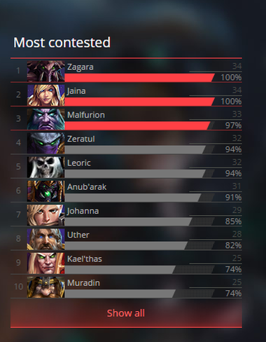 - Looking at the contested picks, we have some clear leaders with Zagara and Jaina being a permanent part of drafts, and Malfurion missing only one. Right after, we have Zeratul, accompanied by our newest addition Leoric, who didn’t need a lot of time to become the new popular pick in the EU meta.