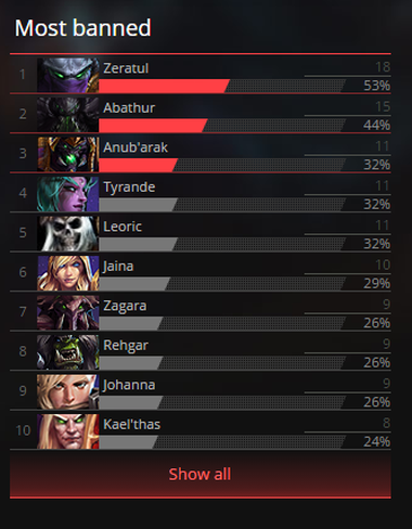 - The most banned section looks pretty standard apart from one thing. It is no surprise that Zeratul leads it with being banned 18 times, but what interests us is the second most banned hero. This hero appears to be the Evolutions Master himself, Abathur.
