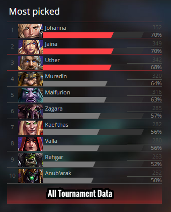 What we see is that regardless of region, good Heroes are good heroes. The lists feature 9/10 of the exact same heroes, however, their placement may indicate some strategies concerning play style. The similarities do tell us about how the game is operating as whole right now. Johanna and Muradin are the cream of the warrior crop, while Anub'Arak is a great bug to bring along if you've already got a strong warrior. The mages won't be denied, as both Jaina and Kael'Thas are too strong to not pick. Zagara is the top specialist, and Uther is leading the way for supports. And then we have Valla who has been good since the beginning of time. However, where Valla is picked does start to show the divergence in metas.
