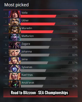 The two heroes which differ on these lists are Rehgar and Sylvanas. Rehgar is of course a great healer in a team fight, allowing a single target to either dive deep, or tank a ton of damage while essentially get a second life. Sylvanas is great at split pushing and laning. Now consider where Valla is on this list for the SEA championships. Valla is a great all around character, but one of her strengths, even as an assassin, is clearing lanes and pushing objectives.