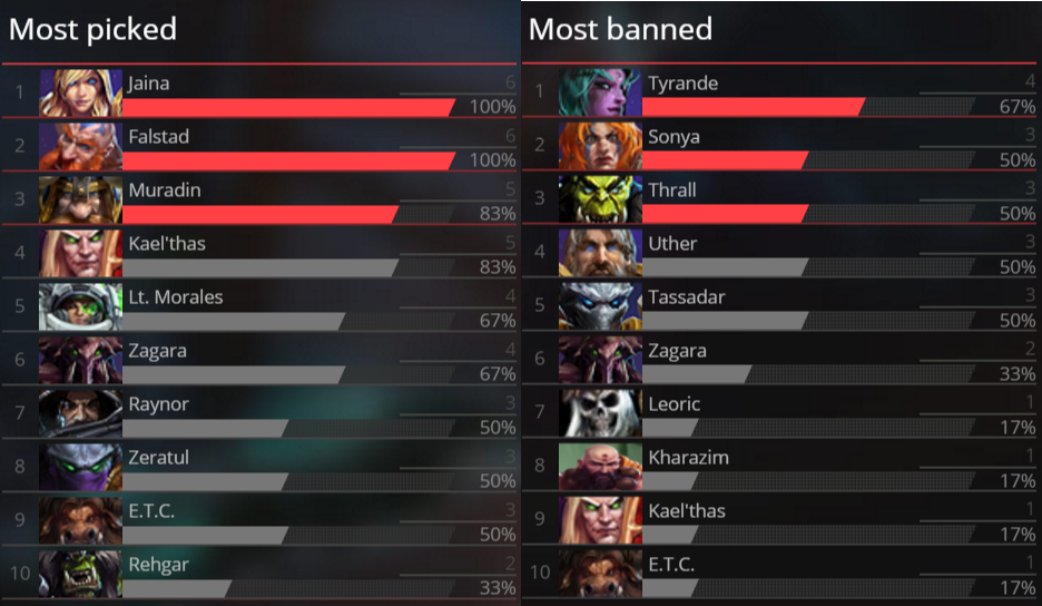 3.) Interestingly enough, the top two North American picks are the top two bans in the European region. European teams don't like to play against Jaina and Falstad seeing as they were banned the most. Jaina's slow and high damage capability can be very tough to deal with and Falstad's mobility can easily shift the tide of a team fight. Europeans must recognize this and try to stay away from it.
