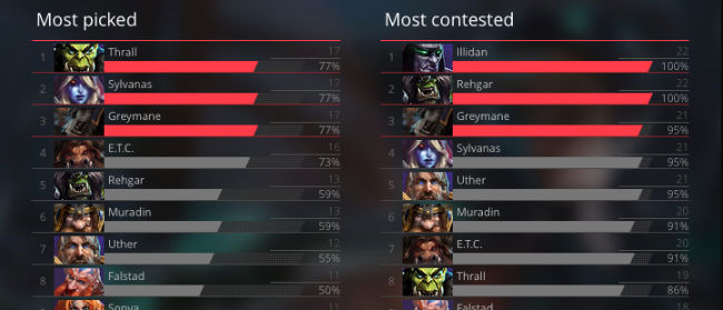 After 30 games in Gold League we’re getting a good idea which Heros in the latest patch are rising in popularity. No surprise that the reworked Illidan, Greymane, and Rehgar are getting picked or banned most often. We’re also seeing a resurgence from Kael’thas and Sylvanas with notable impact.