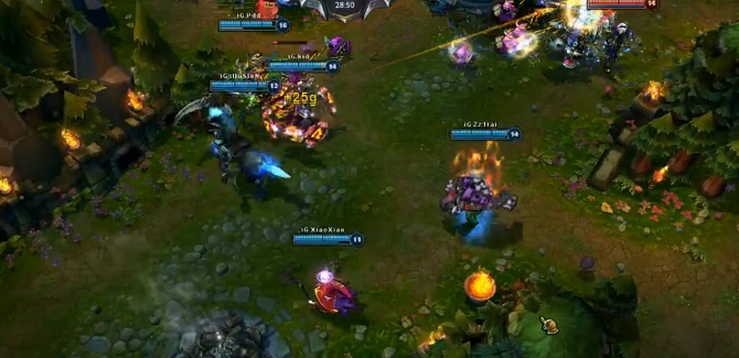 Meanwhile on the opposite end of the map, however, iG takes the first turret of the game. Invictus Gaming really shows their confident aggressive play by pulling off a 3-man first blood top while still managing to poke the middle tower of World Elite's down to a third prior. After Caomei dies top, iG waste no time and take the top turret, pulling out all of the stops for map dominance. Though World Elite humors themselves by surpassing iG in the kill count, IG pulls off some sick micro, managing to catch up themselves while also having the advantage of downing all outer turrets. While World Elite tries to grasp some kind of advantage, they fall short, unable to make many impacts with a 6k gold deficit.