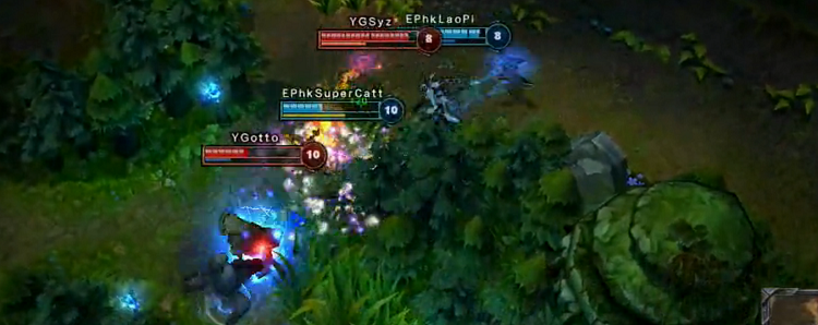 In terms of farm, Young Glory was ahead, allowing them to stay relatively even in gold. Young Glory fell further and further behind in terms of kills due to their overaggression in the enemy jungle, but doing so did allow them to maintain an 3-1 turret lead early on. The game continued to be filled with early skirmishes, where Energy Pacemaker continued to come out on top, but the lane pressure was still heavily in favor of Young Glory.
