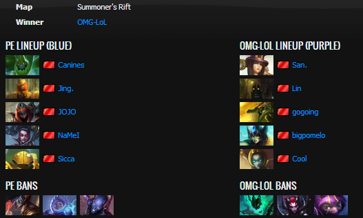 Eventually, Cool made the wise choice to swap to the bottom lane and duel JoJo's Zed after having acquired an armguard, allowing OMG's duo to combat the duo of Positive Energy. Sicca would show excellent mechanics on Blitzcrank, but was unable to acquire kills for his AD carry in lane.