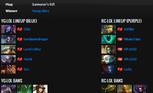 After a 6-0 tower lead and an attempted steal, Young Glory were able to successfully secure a baron. Young Glory showed up huge today and were able to push straight onto the inhibitors. Young Glory were relentlessly aggressive and were able to close out the game, adding one more Shyvana win to the statistics.