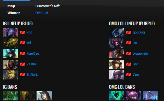 Two current Chinese legends would face off in a game before the last of LPL, wasting no time and starting off with the aggression right away. After a massive bout with several summoners being blown mid for both teams, iG's Kid and OMG's San both started the game out with AD Carry first bloods. Afterwards, the lanes would be formed into typical 2v1 scenarios. Most noteworthy this game was the support TF pick from OMG.