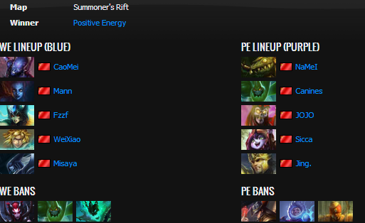 Entering the mid game, the momentum would still stand right in the middle with both teams exactly even on gold. World Elite would try an aggressive approach at taking down PE's towers, but would be overzealous in their approach and would suffer an ace at the hands of Positive Energy. Both teams would continue to engage in battle, and eventually Positive Energy would take baron.