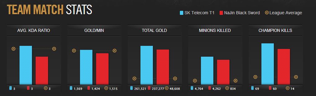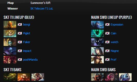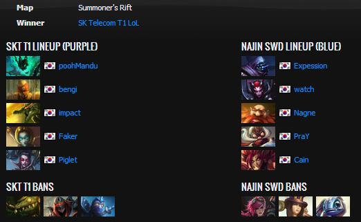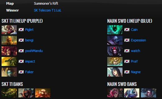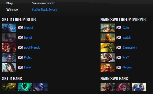 After two barons and a superior late game, NaJin Sword established a larger and larger lead. Between the two barons, however, SKT T1 was able to push despite the baron and 3k gold lead. Eventually, the lead just became overwhelming and were able to push in and take the first game away from SKT T1 in a brilliant victory.