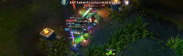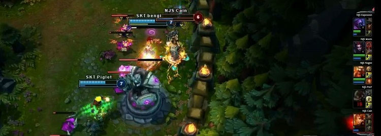 At around the 9 minute mark, all the action started taking off. Expession on the hyper-carry Jax managed first blood with the help of Watch while SKT found a bit of revenge diving bottom. NaJin Sword had superior gold distribution, however, with gold on the better champions. The score was 2-2 with SKT in the lead due to the early dragon. With an ill timed blue pill, Faker was able to single handedly take middle turret.