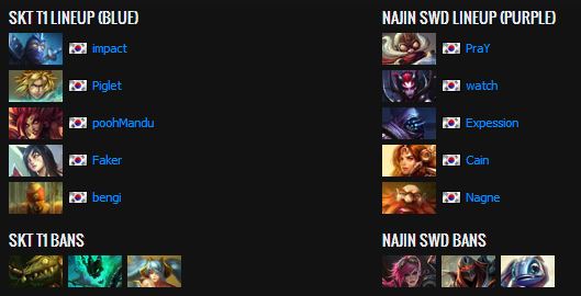 The last game of the night featured Najin Sword pulling out a double global composition, hoping on a snowball onto the bottom lane of Pray and Cain. SKT T1 acquired the early advantage with a delayed invade on NaJin Sword's blue buff, stealing away the blue buff onto Bengi and delaying Watch's Nocturne jungle. Najin Sword recovered from the early steal and stayed very even in gold in the early game with no kill going out.