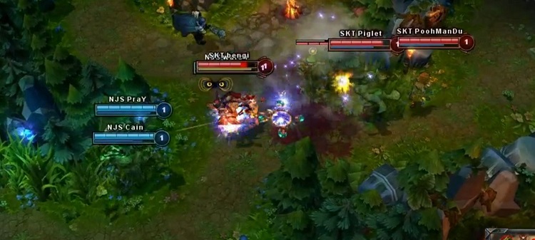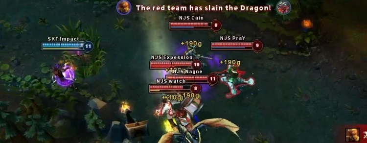 Around 7 minutes, 4 kills went down on the map after a crazy fight up top while Impact found his own kill in the bottom. However, patience was a virtue for Faker, who waited in a bush to take out SKT's jungler, grabbing the dragon. With a dragon and tower advantage, SKT T1 found themselves 1,000 gold in the lead. NJS picked up the aggression with their dives in order to catch up in gold, evening it out around 14 minutes.