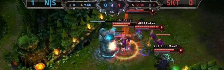 After a nearly escaped death for Nagne, he suffered one of the most embarassing deaths, feeling safe behind the turret and getting assassinated by Bengi's Lee Sin behind tower, resulting in a 3-0 lead for SKT within 5 minutes. Najin Sword would continue falling further and further behind with Impact picking up a kill bottom and continued diving onto top lane. Faker, however, was able to acquire the first kill on the team.