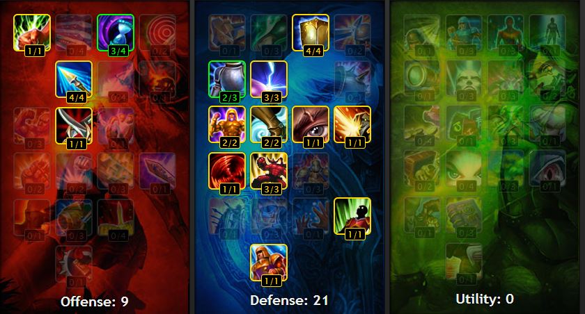 In the defensive tree, you take everything that reduces crowd control and reduces damage, ignoring points in regen, minion damage, and damage reflect. This is because this is the most point-efficient bulid and also grants you the largest advantage in lane. However, as each point after the initial point in Hardiness and Resistance offers diminishing returns per point, you're welcome to place them in other areas if you wish.
