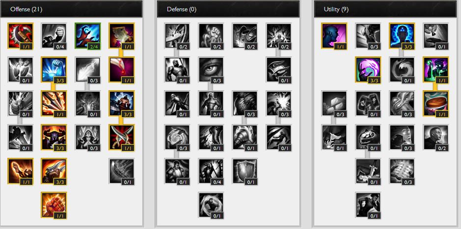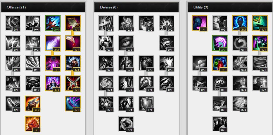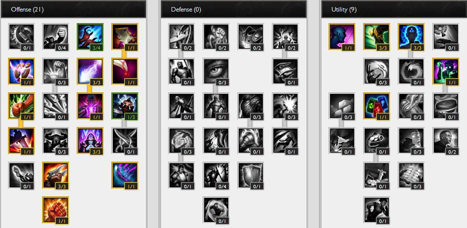 This is the best balance I could find for AP, despite how hard I wanted to make 9/0/21 work (or any variation with more than 9 in utility). It turns out that most of the right-aligned masteries in Offense are way too important for mages, and going without any % magic pen is brutal. The only thing you should really be switching around is maybe one point in offensive CDR for Double-Edged Sword, though it's a bit risky, especially if you end up getting camped.