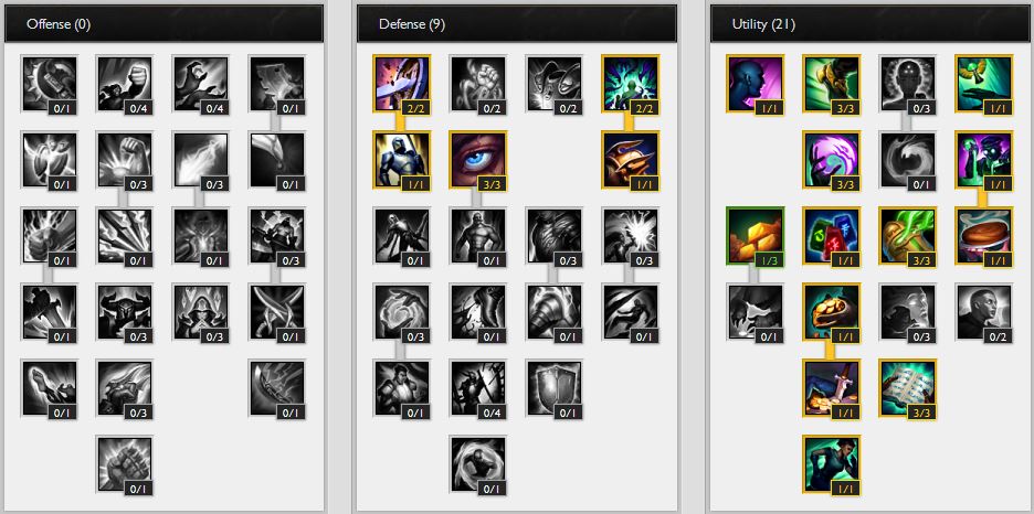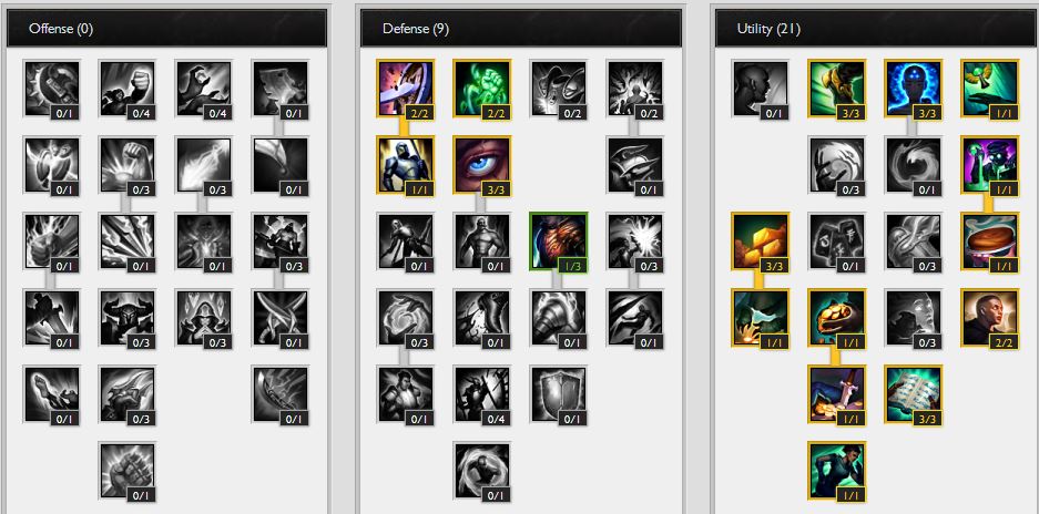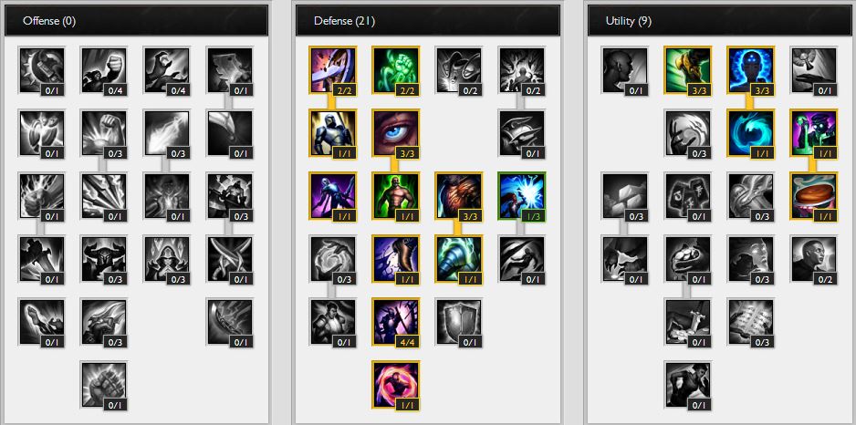 This one is pretty much a no brainer since Riot clearly designed this tree to help supports stay relevant late game. You take the sustain and damage reduction points in defense and throw the rest into utility where you make gold, get more experience, and move faster around the map. I honestly feel like you're gimping yourself if you don't pigeonhole yourself into this build.