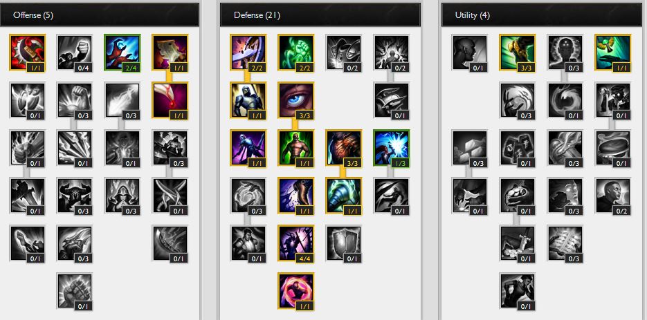 (I like Singed a lot so he gets his own page.) This was actually really tough to theorycraft because 21 utility seemed extremely tempting. However, weighing the two against each other, the defense tree had more to offer and makes Singed's laning much less painful. One very important thing to note is that Strength of Spirit was moved higher up the tree in Season 4, so even without heavy investment into utility, you'll be rewarded for your mana. I only took the first two regen points in the defensive tree because the CC reduction and crit damage reduction are too important.